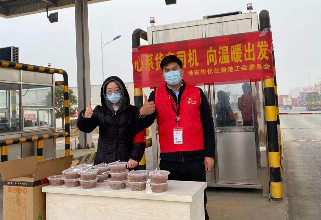 1月10日,腊八节当天早上,由淮安传化公路港物流有限公司党支部组织的“心系货车司机、向温暖出发”送粥活动在该公司进出港通道举行,党员志愿者们将一碗碗热气腾腾的腊八粥端给货车司机,将一份暖暖的祝福送给进出公路港的驾驶员们,传递党组织的关爱和温暖,受到货车司机们的热烈欢迎和点赞!