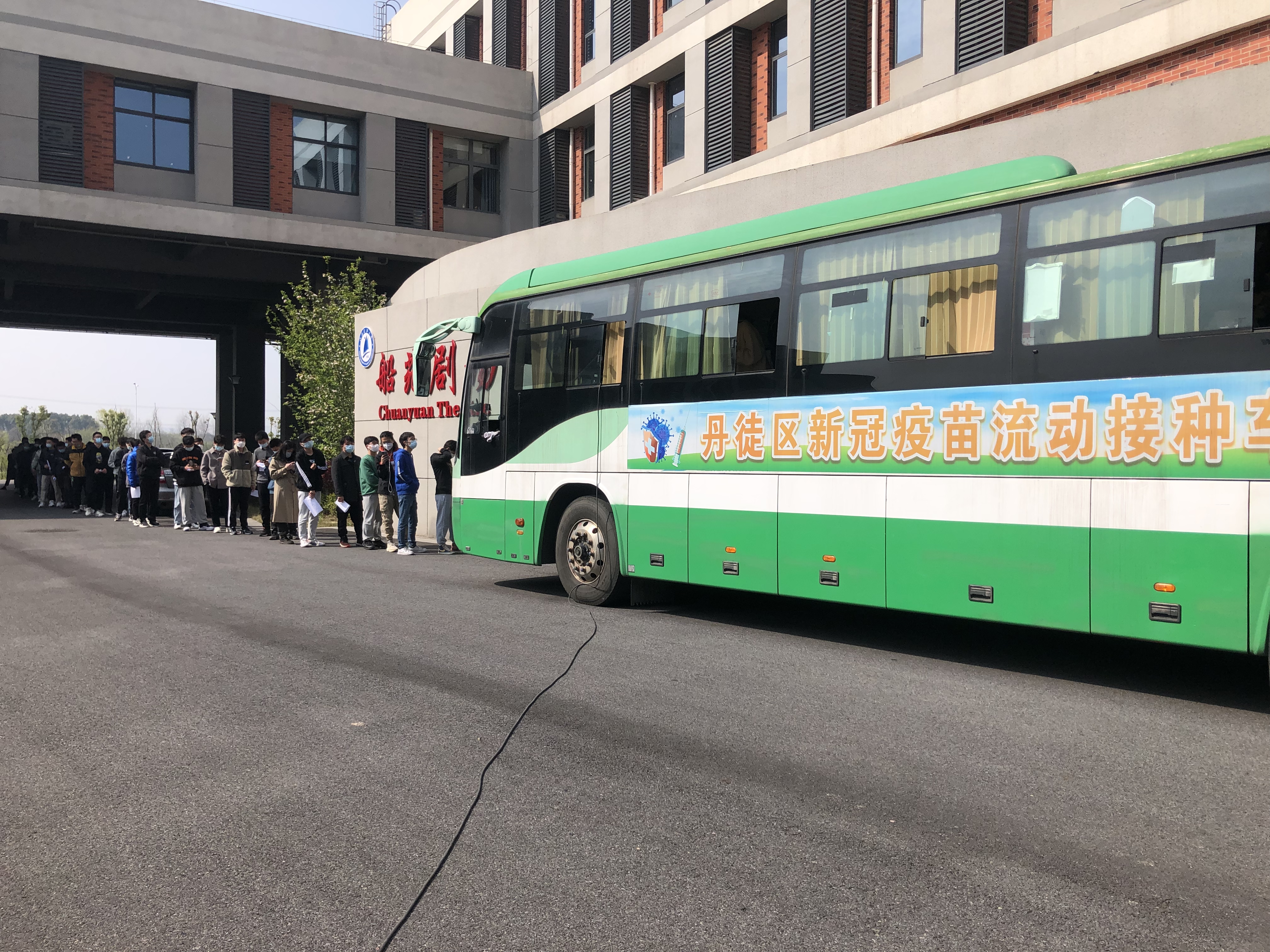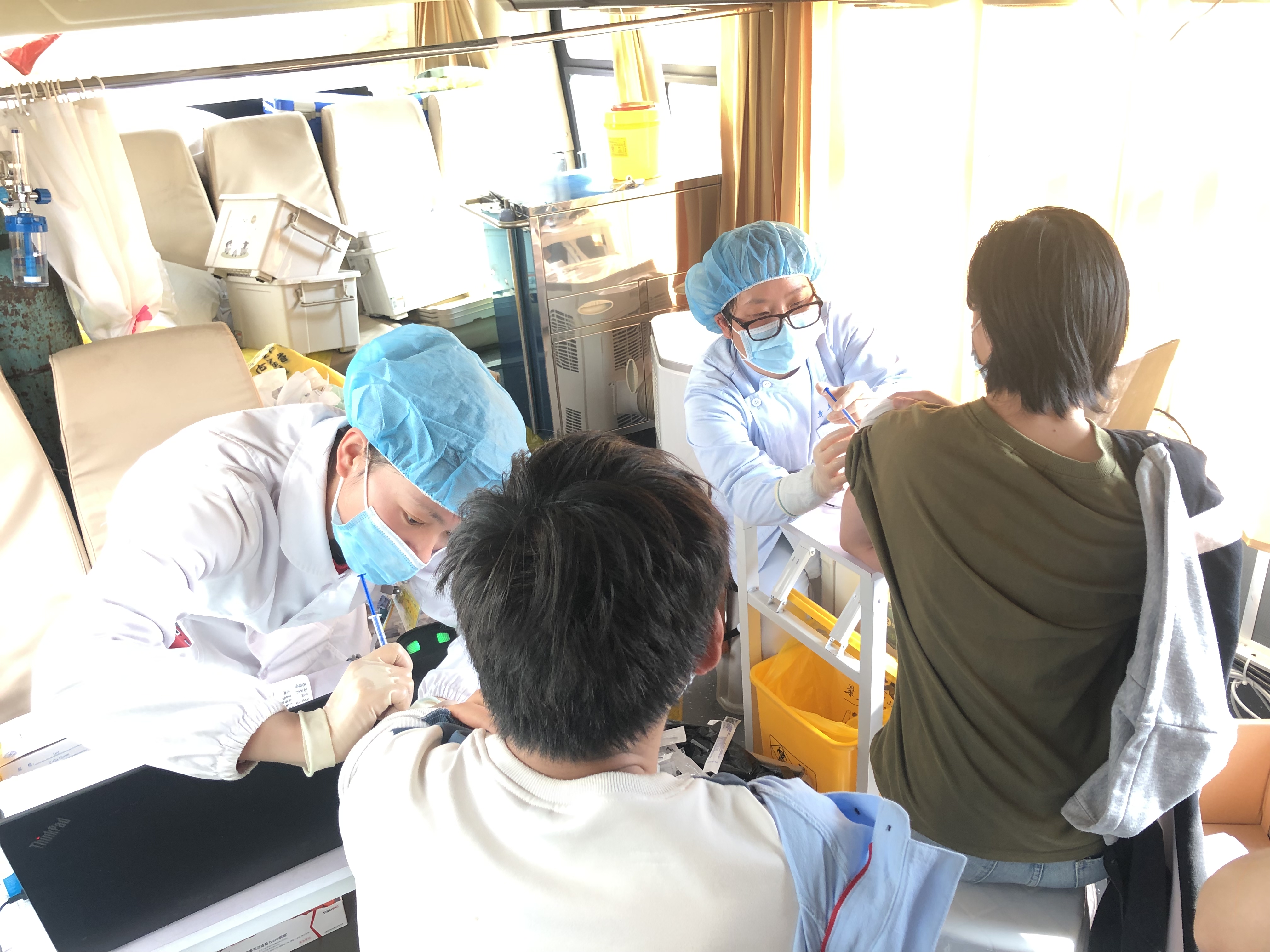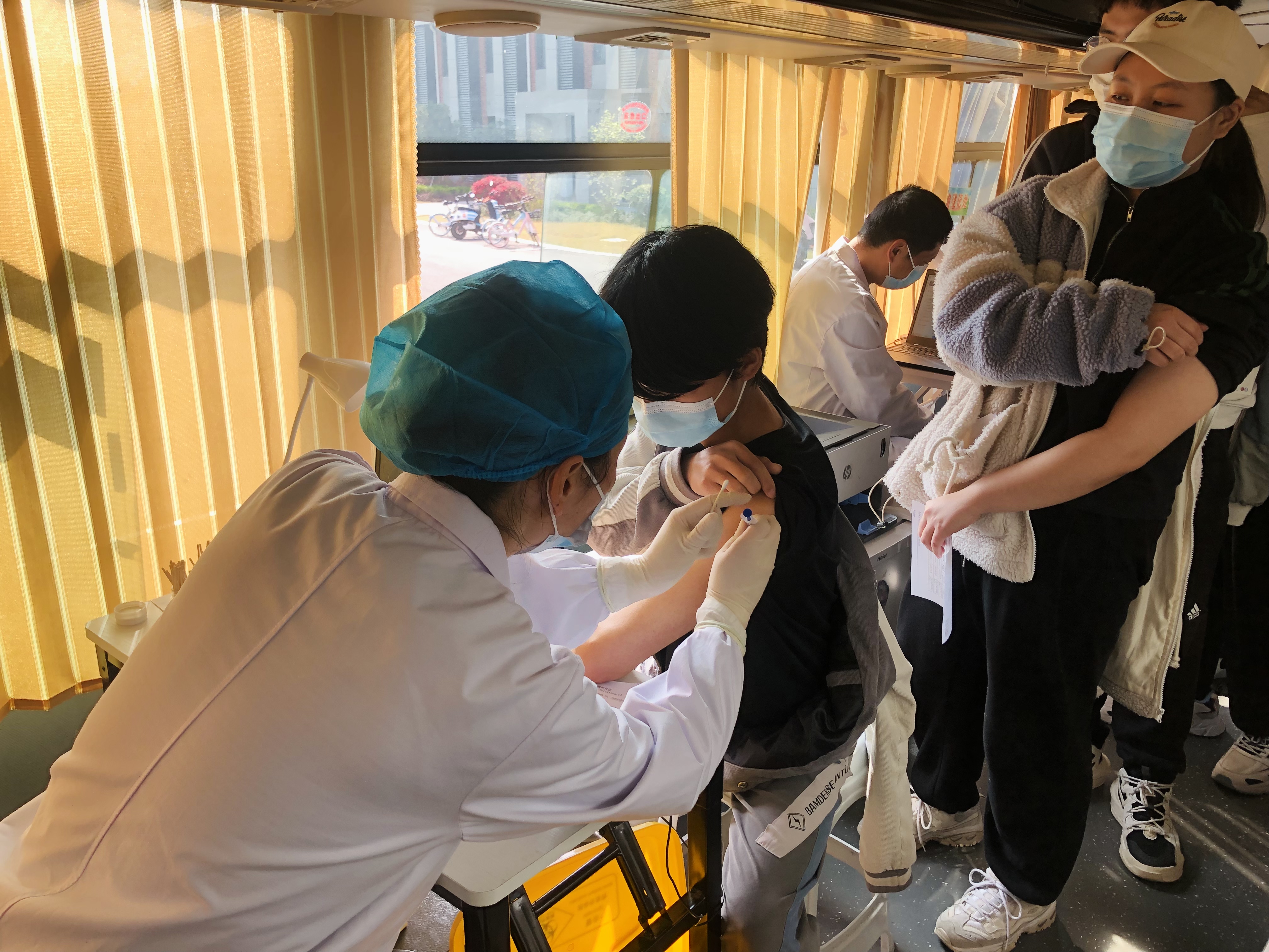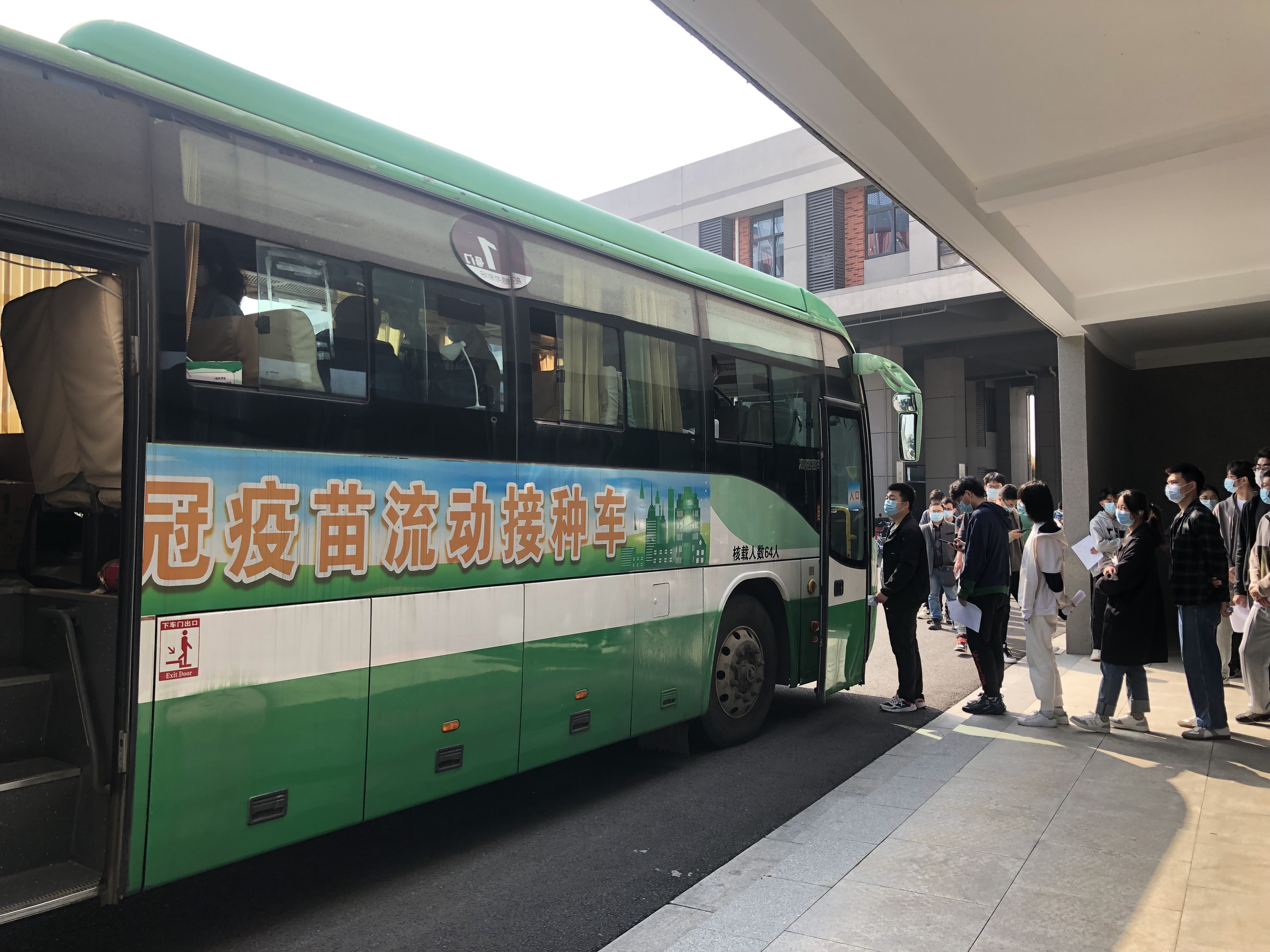 3月30日上午,镇江市丹徒区卫健委的医务人员来到江苏科技大学长山校区为师生接种新冠疫苗,今天医务人员乘坐的是经过特殊改造的新冠疫苗流动接种车。现场的镇江公交二分公司相关人员介绍,这辆新冠疫苗流动接种车是由车长12米的公交车改造的,车内外共设置等候区、健康申报区、疫苗接种区等区域,其中疫苗接种区共设4处接种点,配备有医用冷藏柜、医用小冰箱等设施,确保疫苗储存温度在2-8℃的标准范围之内。