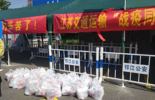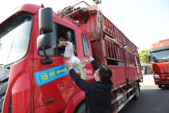 在启扬高速瘦西湖出入口,由邗江区委组织部与区交通部门送来的关爱货车司机大礼包,暖了一路劳顿的外地货车司机的心。交通部门准备的暖心大礼包不光有防疫物资还有生活物资,现场志愿者在服务的同时还不忘叮嘱驾驶员做好个人防护,注意行车安全,有诉求和困难直接与交通部门或者卡口工作人员联系。