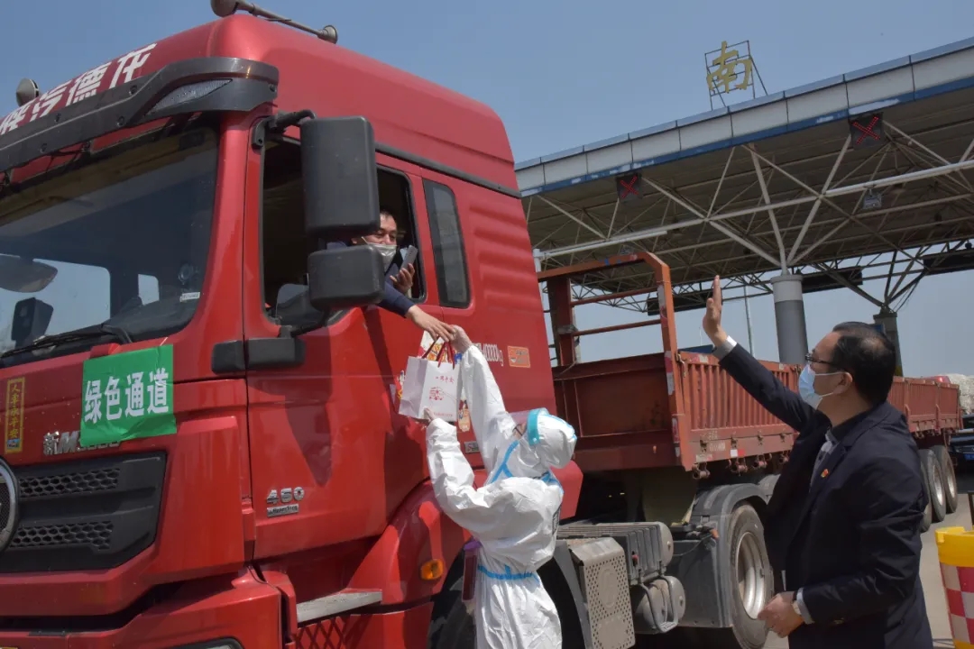 在沈海高速南通北疫情防控服务点,相关单位领导向过往货车驾驶员送上“爱心礼包”。此次共准备了6000份“爱心礼包”向过往货车司机发放,内含口罩、毛巾、香皂、面包、矿泉水等物资。