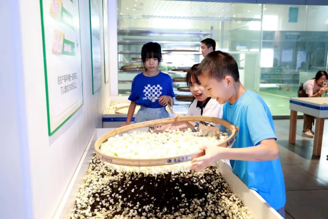 交通职工亲子在横州市中华茉莉汲萃园体验筛茶。