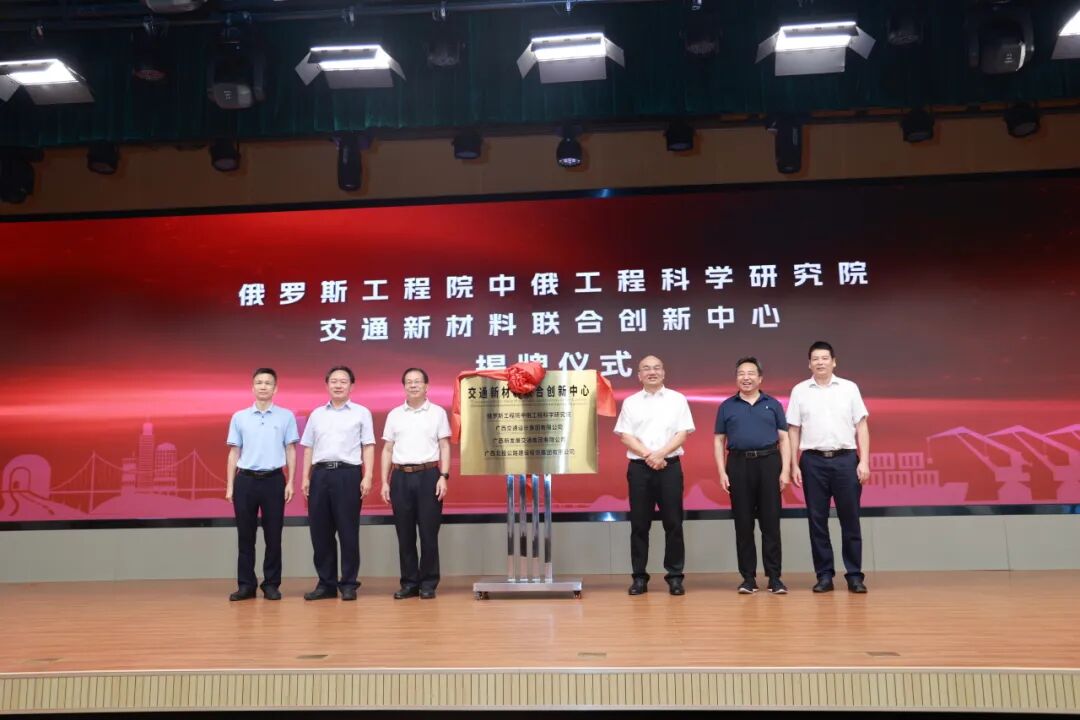 在广西交通设计集团,与会嘉宾共同为俄罗斯工程院中俄工程科学研究院交通新材料联合创新中心、地质灾害防治与地质环境保护国家重点实验室东盟(广西)中心揭牌;