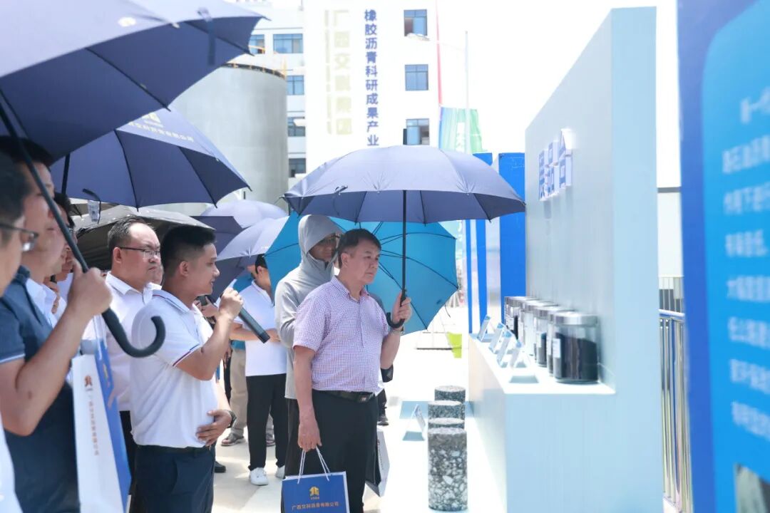 在广西交科橡胶沥青科研成果产业化示范基地,与会人员了解橡胶沥青系列技术材料与应用等情况,并到龙门大桥项目实地参观东岸展馆和施工现场。