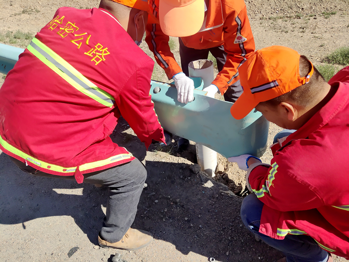 五是自查维修交安设施。实地核查沿线交安设施的完备性,及时更换,补充维修损坏的波形梁护栏、轮廓标、标线、标志标牌等,确保迎检路段安装规范、标识清晰、功能完好。共计更换柱式轮廓标276根,更换示警桩反光膜296个,更换波形梁116m,更换里程碑12块。