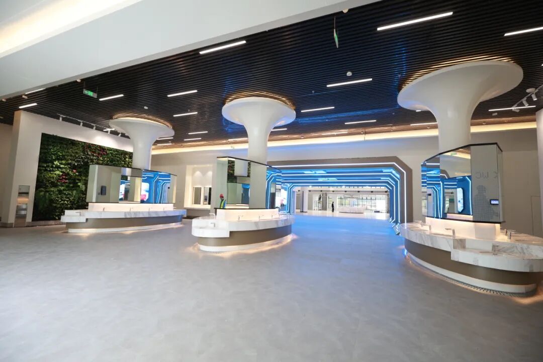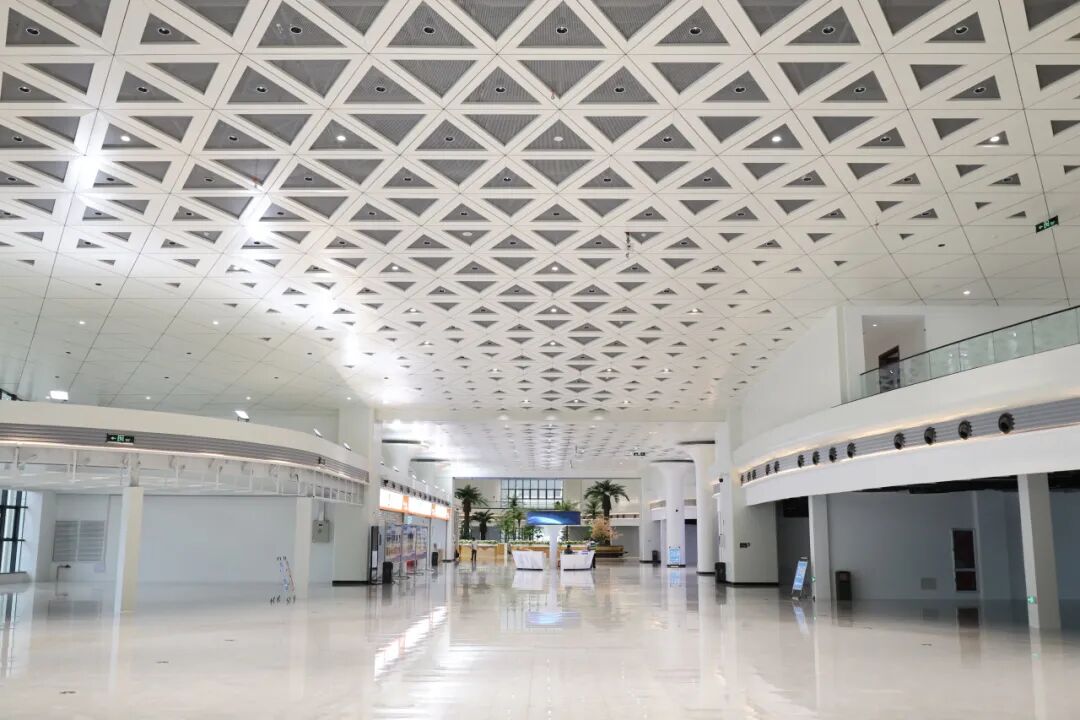 金山服务区综合楼施工严格贯彻策划先行、样板开路、过程控制、一次成优的管理理念,综合楼整体强调对称突出轴线,外立面以玻璃幕墙为主,搭配金属铝板,取代了传统厚重的墙体。室内采用双层设计,大型立柱撑起超大空间,吊顶角形镂空图案疏密有致,呈现星光点点。顶部钢网架约5580平方米,整体跨度39米,为克服顶部铝板装修悬挑大、跨度大的施工难点,项目在安装时运用BIM三维模型技术,确保铝板拼接整体线性有序,缝隙均匀一致,最后搭配柔和的反射式灯光,勾勒出三角形的精致轮廓,颇具现代美感。