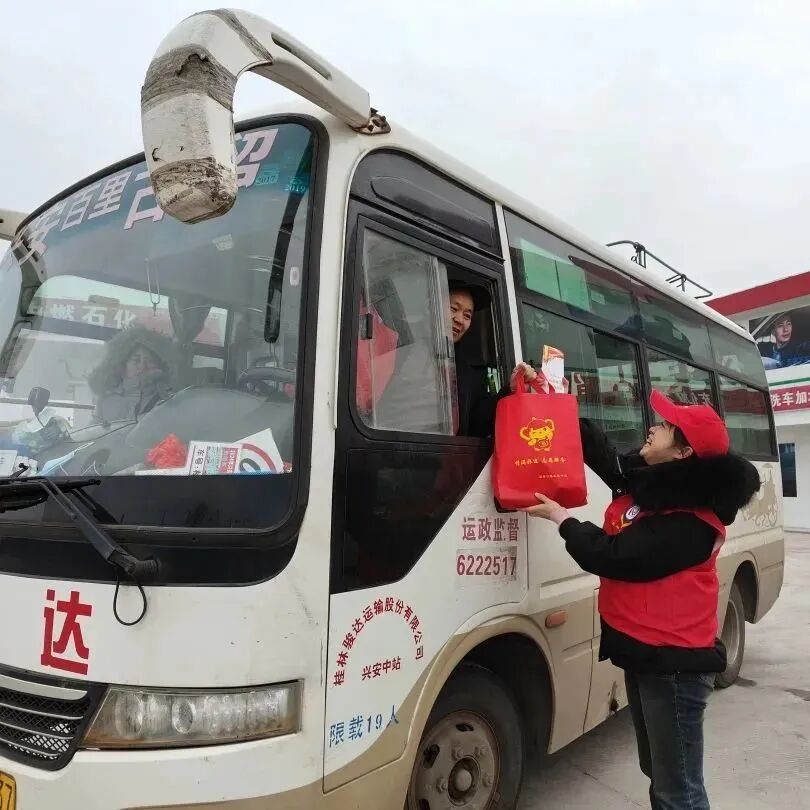 1月26日,桂林公路发展中心联合兴安、灵川公路养护中心和广西威航道路工程有限公司开展“关爱卡车司机,情满八桂公路”暨“情满旅途,交通人温暖归家路”学雷锋志愿服务活动。严寒天气中,公路青年志愿者们及时铲雪除冰,救助打滑车辆并为司乘旅客送上热姜茶;在“司机之家”为司乘旅客送上新春对联、福字、泡面、八宝粥以及常备的急救药品等暖心礼包;在桂林西站,志愿者们为返乡的游子煮饺子、泡泡面,送上关爱礼包。