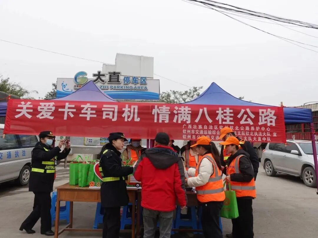 钦州钦北公路养护中心联合钦州市交通运输综合行政执法支队钦北执法大队、钦州市公安局交通警察支队三大队大直中队在大直停车区、那天石场开展“关爱卡车司机,情满八桂公路”学雷锋志愿服务活动。志愿者们清理服务区环境、向卡车司机发放“关爱卡友大礼包”,并赠送“福”和砂糖橘等新春礼品。