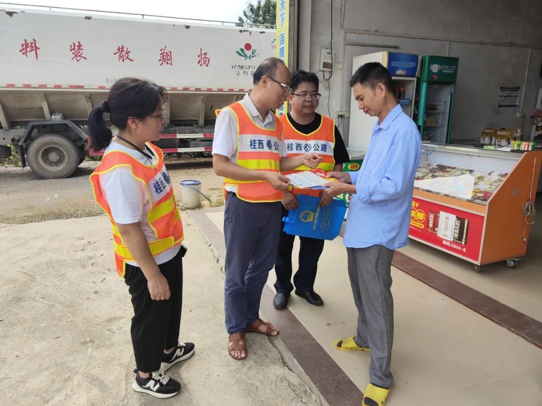 在国道322线来宾市合山市过境线与省道510线交叉路口,该支队第三大队联合合山市交通运输局、兴宾公路养护中心、合山市公安局交通警察大队等部门设立宣传点,向过往司乘人员和群众发放宣传资料,并讲解公路安全保护的基本知识和相关法律法规。同时,工作人员还深入企业、街区,通过面对面宣传,提升企业和广大群众遵纪守法、爱路护路的责任意识和行动自觉。