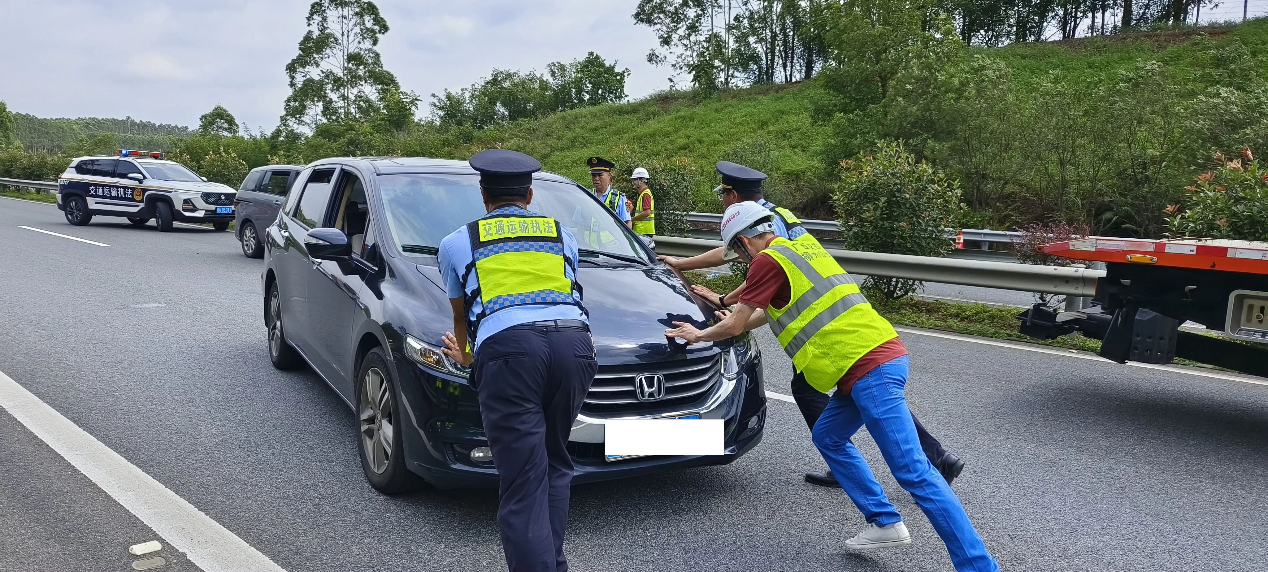 执法人员联合高速公路运营公司工作人员救援被困车辆。