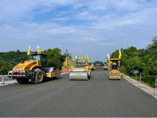 机械轰鸣、车辆穿梭,摊铺机匀速前进,压路机来回穿梭,运输车有序倒料,现场技术和检测人员全程参与,对施工环节严格把关,确保压实度、平整度、厚度等各项指标符合设计规范要求。房建、交安、机电作业人员有条不紊地穿梭于各自岗位,工程建设进度快速推进。各项目部采取错时施工,不间断提供绿豆汤、藿香正气水等防暑降温物品,为施工人员的身体健康和工程的顺利实施提供了强力保障。