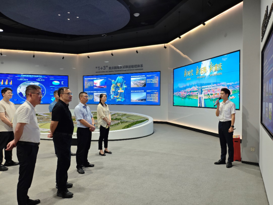 7月17日,考察组在重庆市珞璜港码头作业平台,现场了解了港口枢纽与铁路物流枢纽、综合保税区的无缝衔接情况及“公水铁”多式联运建设、运行情况。在重庆市果园港,参观了自贸区展厅、“前港后园”码头功能布局,听取了果园港加快建设内陆国际物流体系、配套设施、现代物流产业集群、绿色智慧物流等情况介绍。与重庆市交委在果园港召开交通水运发展座谈会,双方围绕岷江高等级航道建设、水运提质倍增、港口建设与枢纽作用发挥、多式联运、行业发展环境优化、旅游客运精品航线建设等方面进行了深入交流。双方协商将进一步深化两地水路运输合作交流,围绕探索开行干支联运集装箱航线、“水水中转”等展开合作。