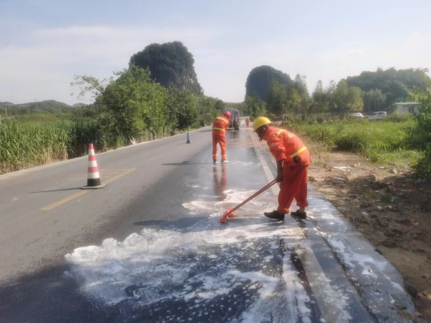 融水讯(通讯员 梁仕凯 摄影报道)近日,融水公路养护中心辖区国道357线融水县永乐镇路段发生一起运输油品车辆泄漏事故,事故导致该路段约500米路面受到污染,现场路面湿滑,影响行车安全,存在较大交通安全隐患。