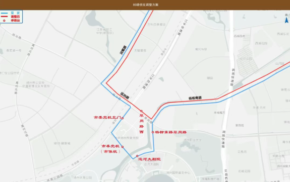 3、89路由蜀冈公交首末站始发,按原线路行驶至扬冶路与体育公园路交叉口后,改道扬冶路、翠岗路、杨柳青路通行,上下行线路走向一致。撤销市委党校北门、市委党校(市体校)、运河大剧院、杨柳青路翠岗路(注:公交四公司始发方向停靠)4站,增加翠岗路西1站。