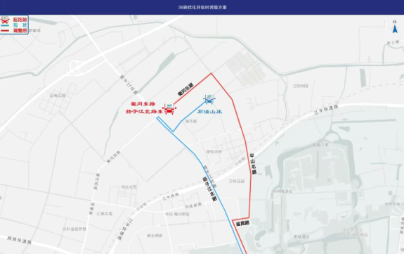 1、39路由江海学院公交首末站始发,按原线路行驶至扬子江北路与鉴真路交叉口后,改道鉴真路、平山北路、朱塘路通行至光辉岁月南(受朱塘路道路施工影响,临时改道平山北路、蜀冈东路通行至蜀冈东路扬子江北路东),上下行线路走向一致。撤销扬子江北路双塘东路北、江阳商贸城、扬子江北路江平东路、扬子江北路司徒庙路南、光辉岁月南、石油山庄6站,增加养怡花园、江阳创业园、朱塘小区、朱塘中苑、平山乡(平山路)、鉴真图书馆、国联制衣厂、罗思韦尔、蜀冈东路扬子江北路东9站。