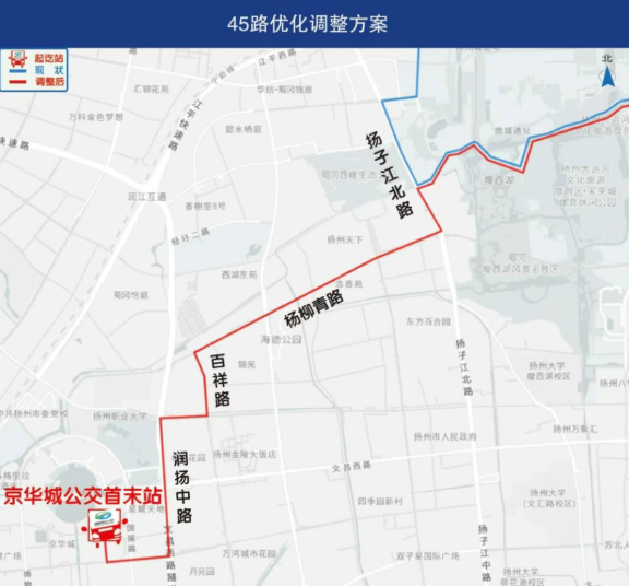 2、45路由文昌花园公交首末站始发,按原线路行驶至平山堂西路与扬子江北路交叉口后,改道扬子江北路、杨柳青路、百祥路、翠岗路、润扬中路、京华城路、怡景路通行,上下行线路走向一致。撤销花都汇西、堡城孙庄、堡城村、西华门、平山乡(平山路)、朱塘中苑、朱塘小区、江阳创业园、养怡花园、石油山庄、光辉岁月南、五亭龙东门、小官桥、扬子江北路荷叶路南、公交三公司15站,增加蜀冈西峰、扬州天下南、念香苑北门、念香西苑、柳馨花园南门、山河园南门、百祥路北、紫荆苑、润扬北路翠岗路(注:文昌花园公交首末站始发方向停靠)、交通产业集团、润扬中路京华城路(注:京华城公交首末站始发方向停靠)、五彩世界南、京华城公交首末站13站。