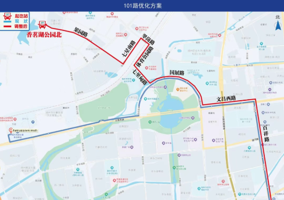 4、101路由广陵经开区公交首末站始发,101路区间由公交四公司始发,均按原线路行驶至国展路与七里甸路交叉口后,改道七里甸路、体育公园路、翠岗路、七星南路、果园路通行,上下行线路走向一致。撤销西部客运枢纽(扬州火车站西)、扬州火车站(注:西部客运枢纽始发方向停靠)、文昌西路站南路东、体育公园、文化艺术中心5站,增加香茗湖公园北、果园路真州中路西、扬州市车辆管理所、果园路润蜀南路西、果园路润蜀南路东、七星南路果园路、市委党校北门、市委党校(市体校)8站。